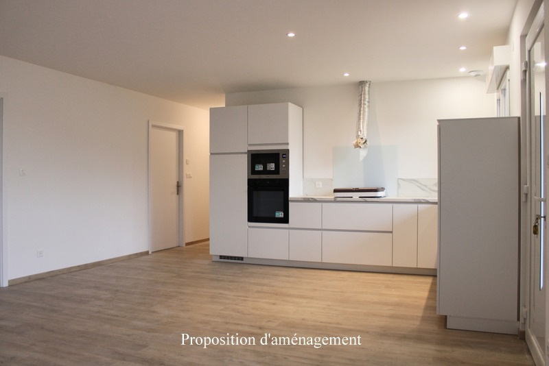 Elle se compose d'une cuisine ouverte sur le séjour, 2 chambres, une salle d'eau, une buanderie et d'un garage.