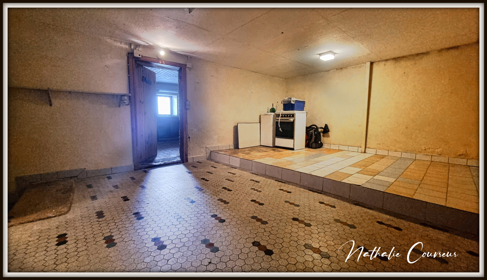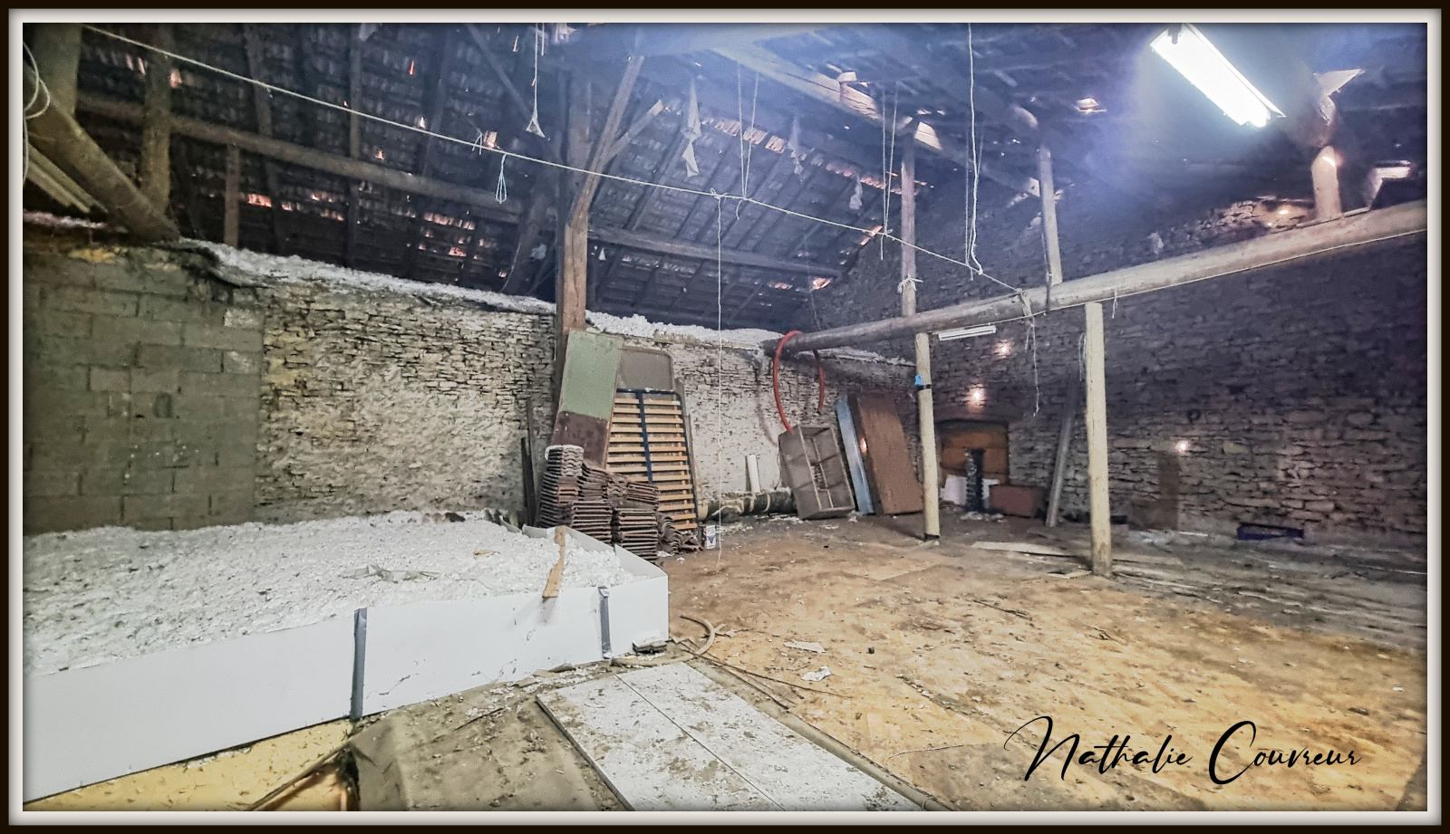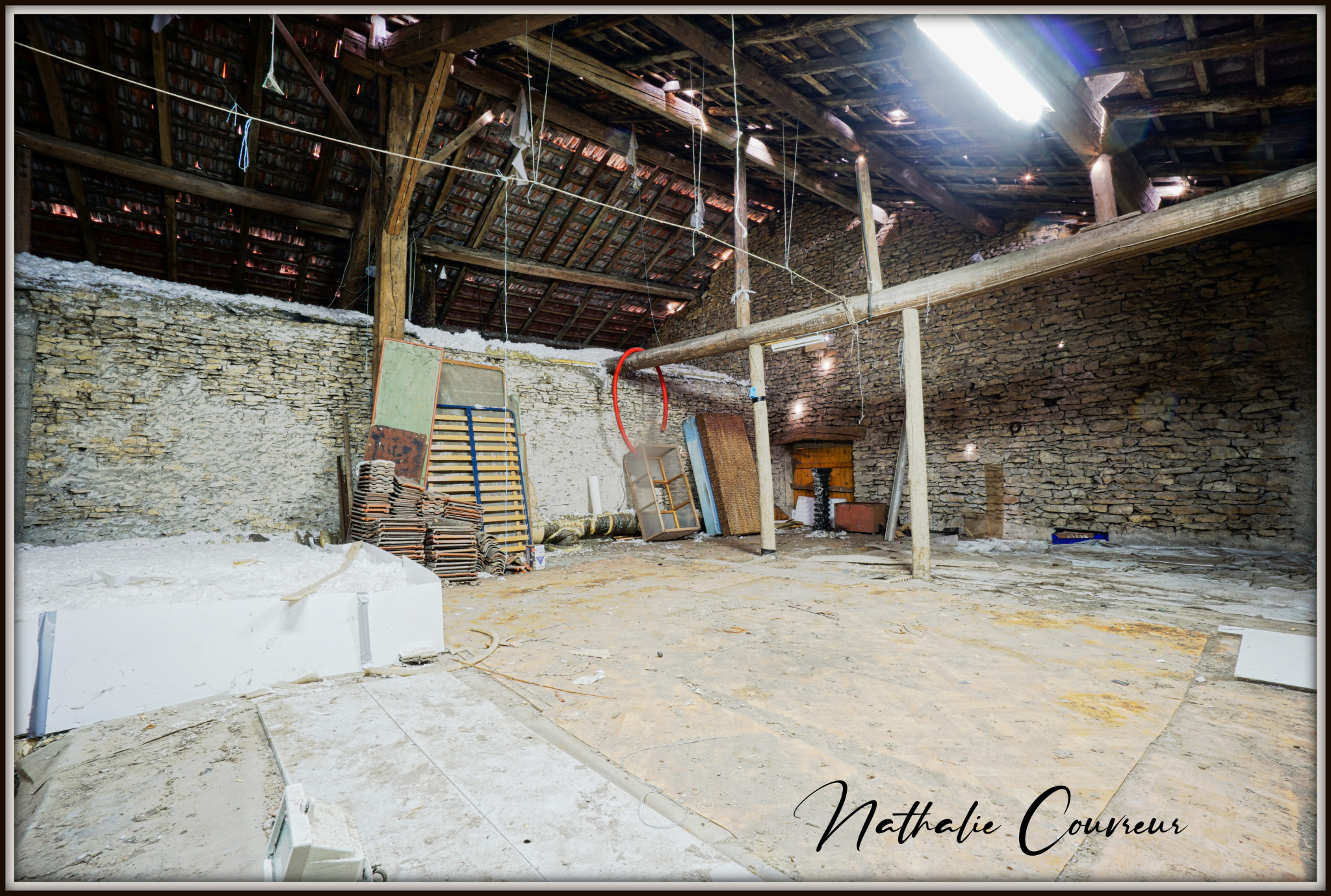 Cette maison dispose actuellement d'une cuisine avec cheminée, une très grande salle-à-manger / salon, 4 grandes chambres, un dressing, une salle d'eau, un WC, un atelier, une cave, un double garage dans une grange, une serre à semis et un immense grenier aménageable. On peut y garer facilement 5 voitures sur des emplacements privatifs. Un parking public se situe à proximité immédiate.